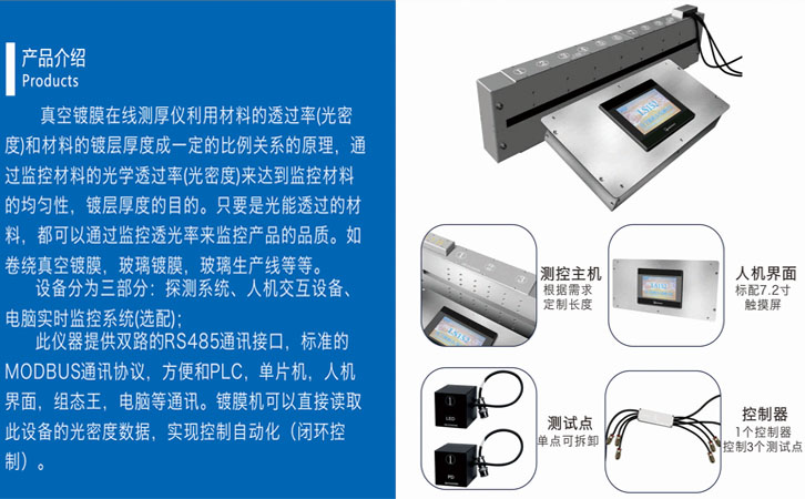 林上科技與真空技術協會的聯系起源于真空鍍膜在線測厚儀。林上生產的真空鍍膜在線測厚儀是一款應用于卷繞式鍍膜機上在線監測薄膜厚度均勻性的設備。儀器利用材料的透過率(光密度)和材料的鍍層厚度成一定的比例關系的原理,通過監控材料的光學透過率(光密度)來達到監控材料的均勻性,鍍層厚度的目的。只要是光能透過的材料,都可以通過監控透光率來監控產品的品質。如卷繞真空鍍膜,玻璃鍍膜,玻璃生產線等等。目前林上真空鍍膜在線測厚儀已廣泛應用于各大鍍膜機生產商的設備上。如:愛發科真空蘭州真空青州寶豐張家港康得新深圳市紀興源等等。