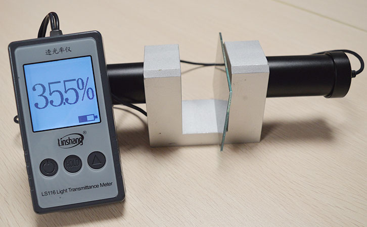 首先兩個探頭吸合,開機透光率顯示數據為100%后,兩個探頭夾著被測材料,對準測量,顯示的數據就是被測材料透光率的數值。