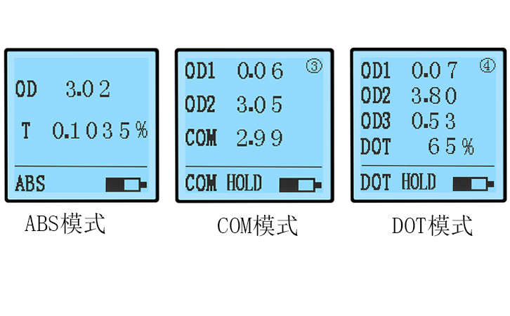 儀器具有3種測量模式,ABS絕對光密度測量模式,COM模式相對光密度測量模式,DOT模式網點面積率測量模式。